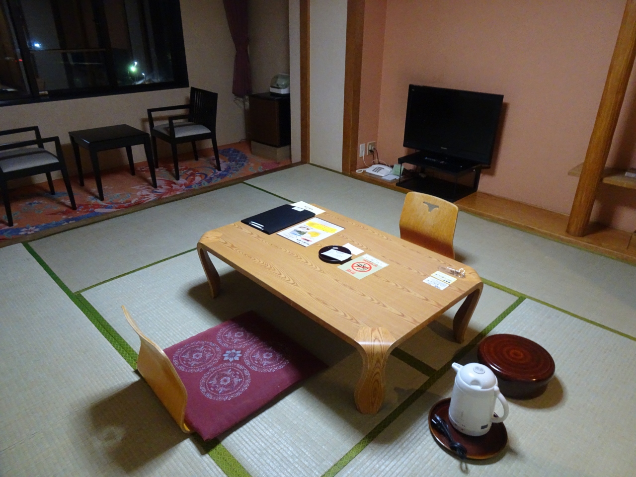 ミネラルウォーターのペットボトルがセットされていたので、湯沸かしポットで温かいお茶を飲むことができました。