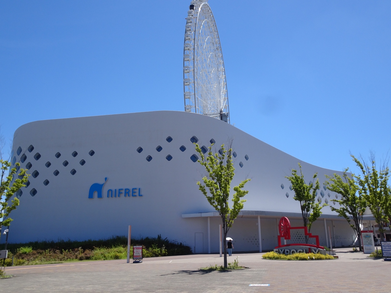エキスポシティに真っ白な壁に青字で「Neflel」と書かれた印象的な建物で、水族館と動物園を兼ねた複合施設です。