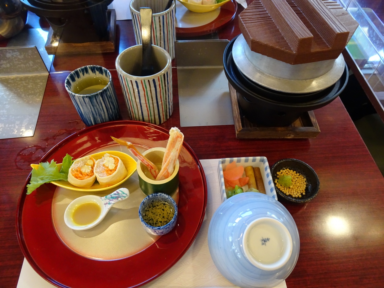 茹でかにと湯葉巻きサラダ、茶碗蒸し、かにシュウマイ、天ぷらと 一品一品出していただいている間に 土鍋の御飯が炊き上がります。