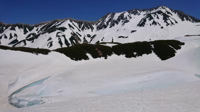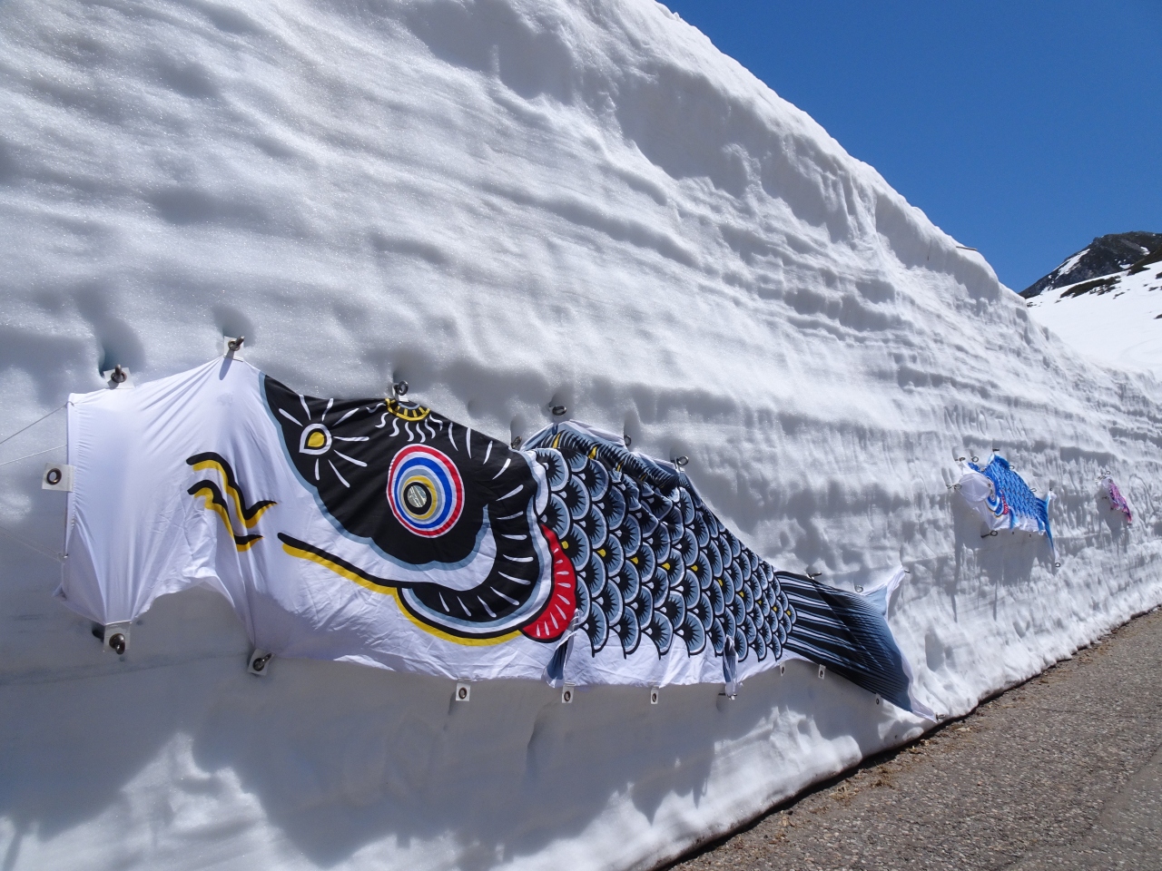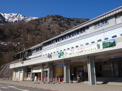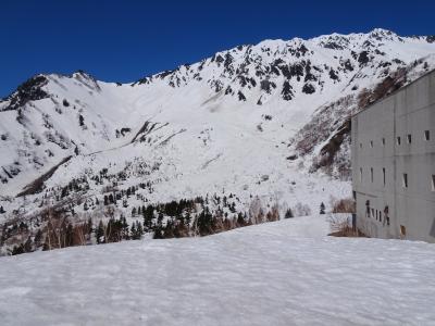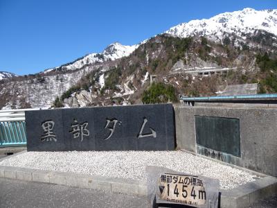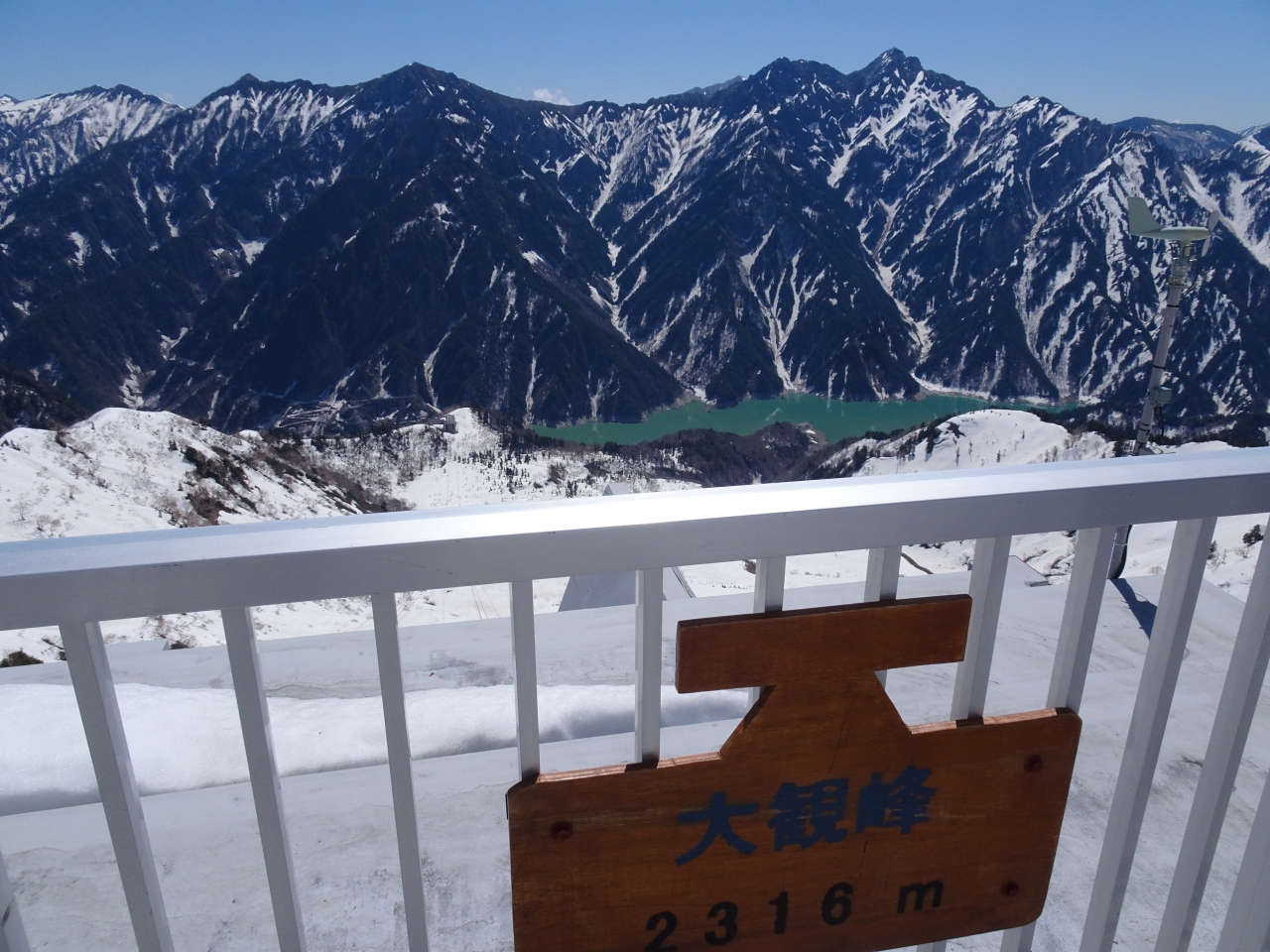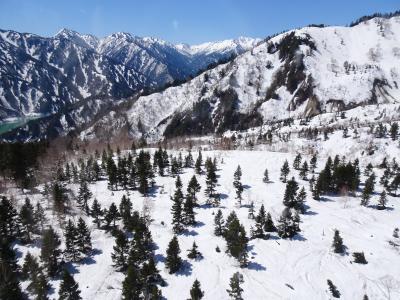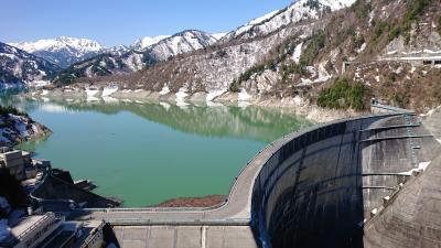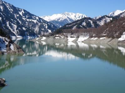 後ろ立山連峰の一面の雪景色が見られ、眼下には黒部湖の深い緑色がくっきりと見えます。