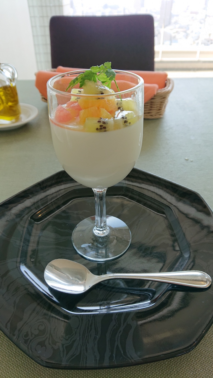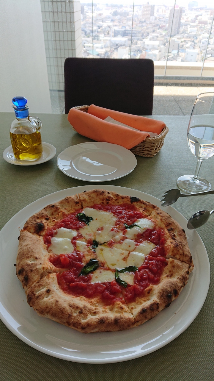全面ガラス張りの窓越しに見える和歌山市内の風景を見ながら、まず お洒落なお皿に少量ずつ盛られた前菜、そしてメインのピザは マルゲリータを選びました。