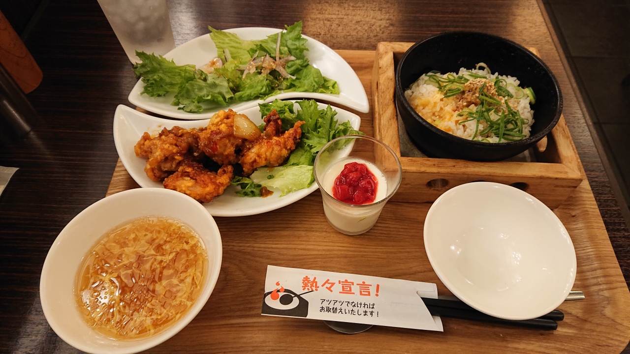 メインの油淋鶏にサラダ、ちょっぴり濃厚な卵のスープ、名物 石焼炒飯に杏仁豆腐のデザート付きです。