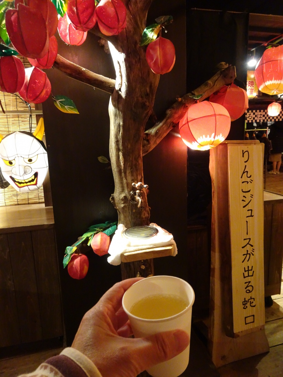 また夜もお楽しみで、ねぶた祭りのショーや方言講座、リンゴの競り体験、屋台などがあり、大浴場の出入口に設置された蛇口をひねれば、リンゴジュースが出てきて飲み放題だったりと、面白い思考が満載で、滞在中は飽きることがありません。