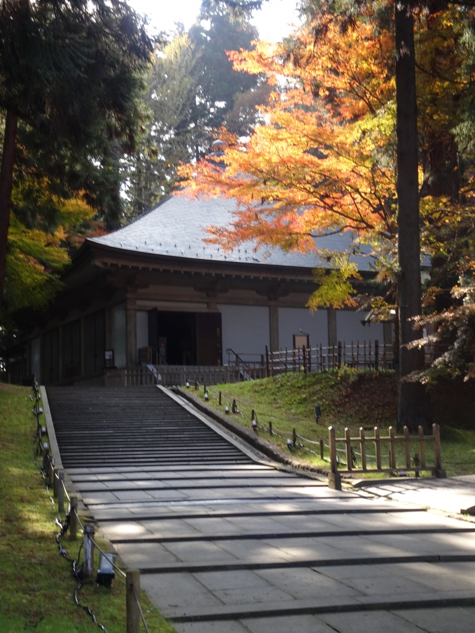 国道沿いの参道の入口から、緩やかな上り坂を歩いていくと、パンフレットでよく見かける金色堂が目の前に現れます。