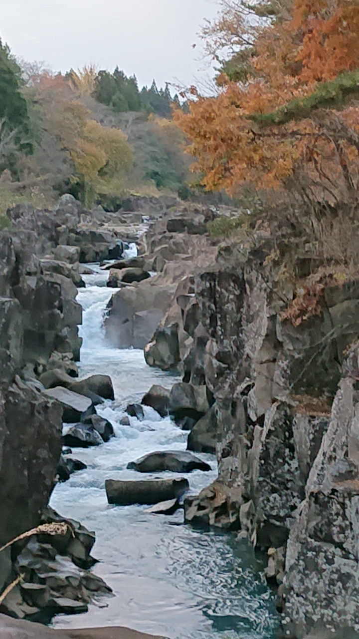 ゴツゴツした岩場を歩いて川沿いに行くと、絶壁の岩場の間を流れる川、紅葉した絶景をながめることができます。