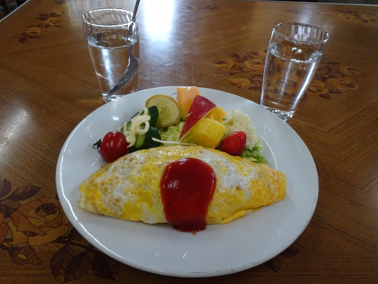 この店のオムライスはワンプレートで、付け合わせに キャベツやキュウリ・ポテトサラダに、色とりどりのフルーツがのっているのが特徴です。
