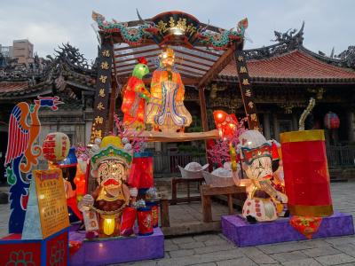 中央の門の上部には「慈祐宮」と書かれ、古代中国の物語を題材とした装飾が豪華絢爛。