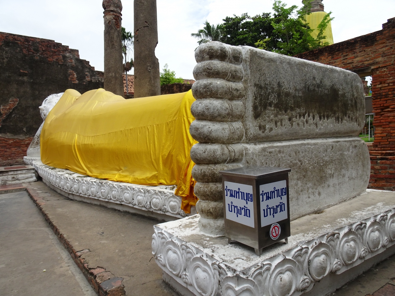 この寺の涅槃仏は、黄色の衣をまとっています。