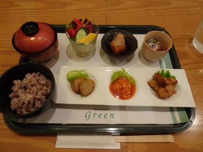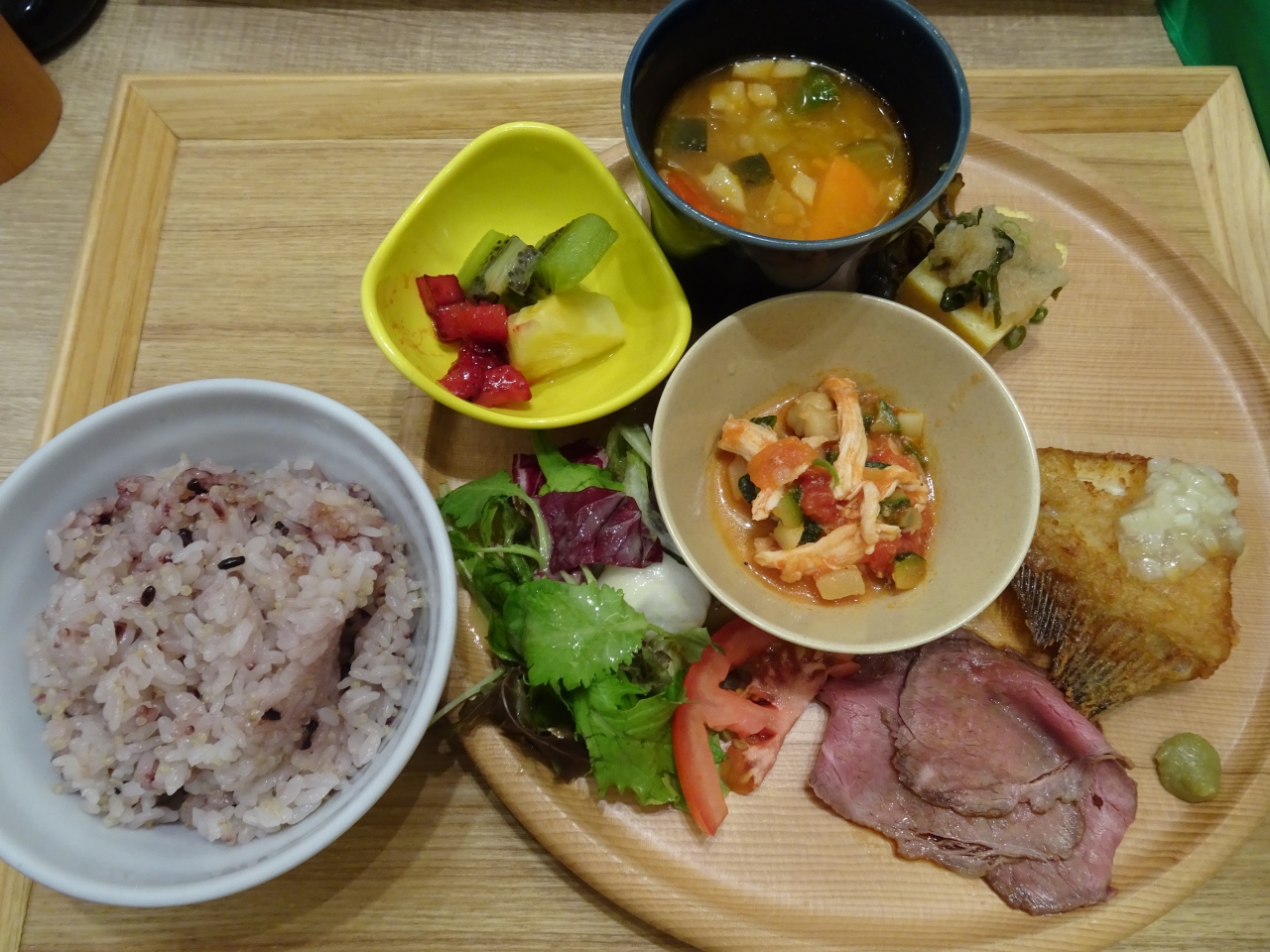 ローストビーフ、カレイのから揚げ、サラダなどのおかずに、御飯は雑穀米を選ぶことができ、味噌汁はおかわりOKという、健康的な食事内容です。