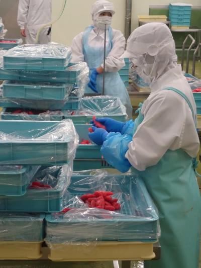 明太子に適したスケトウダラの話から、窓越しに明太子を袋詰めする様子を見学することができます。