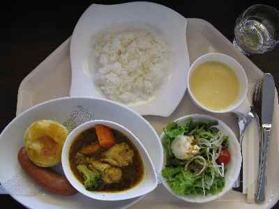 続いて、コーンスープ(またはオニオン)、サラダ、ご飯(またはパン)を取り、お勘定をすませます。