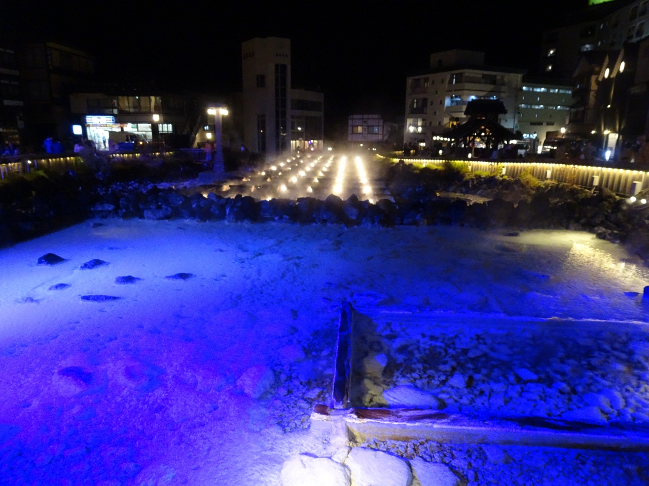 昼間も良いのですが、やはり夜のイルミネーションによって灯される光景、湯けむりは情緒があって格別です。