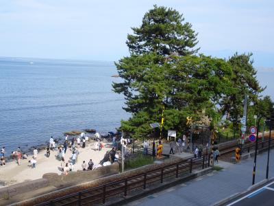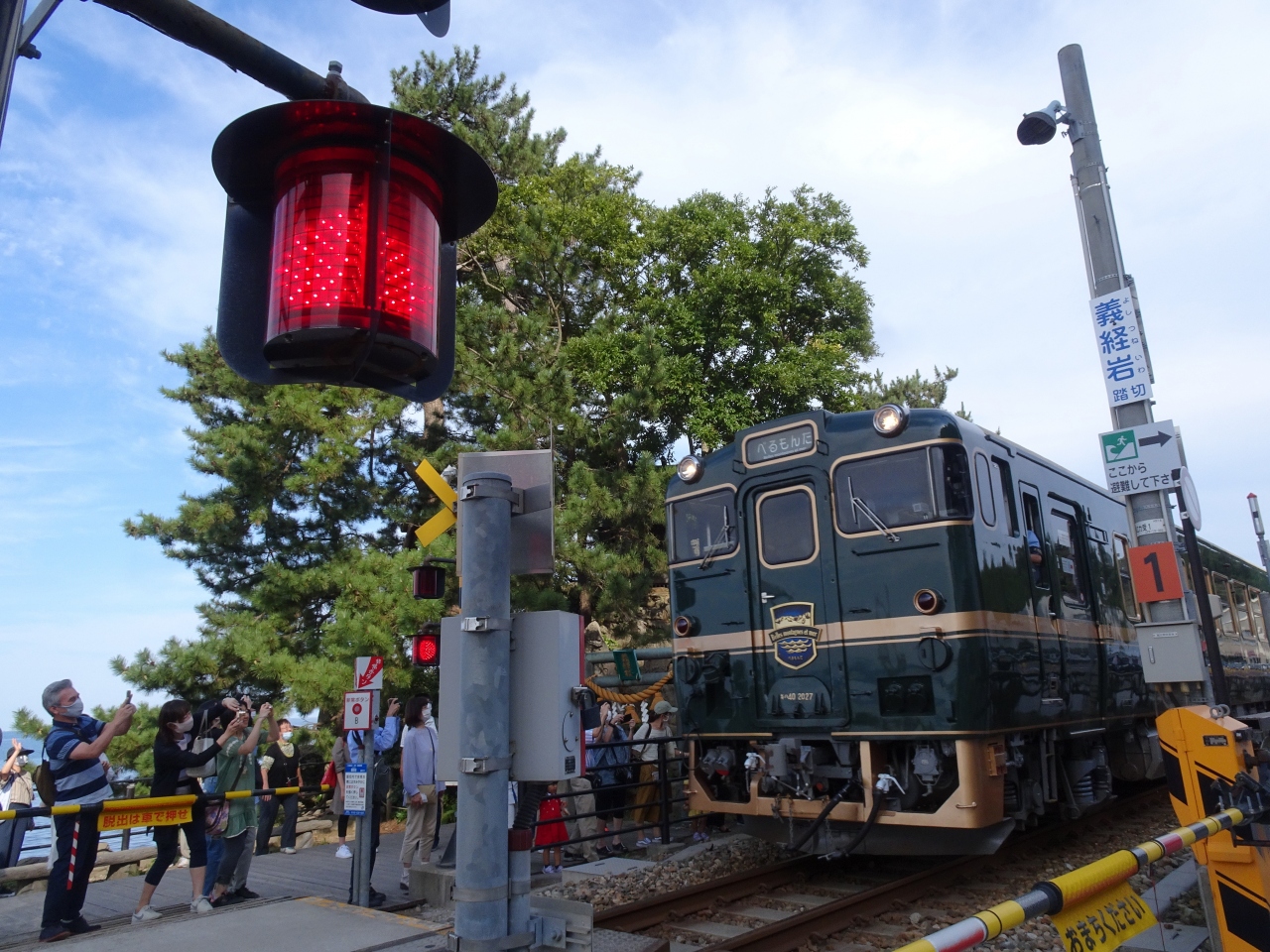 義経岩の前には氷見線の踏切があり、そこに観光列車が通ると 一斉に観光客がカメラを持って集まってきます。
