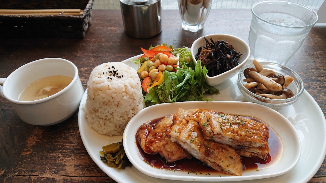 豚肉の揚げ煮をメインに、豆のサラダ、ひじきの煮物、シメジのソテー、雑穀米、スープ。