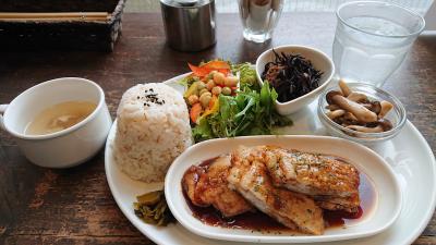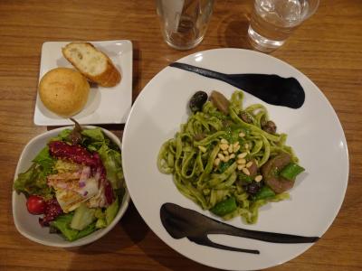 ランチメニューのメインはパスタとピザの中から、地豆たっぷり濃厚ジェノベーゼを選び、たっぷりのサラダにパン、最後は同じテラス内にある丸山珈琲をいただきました。