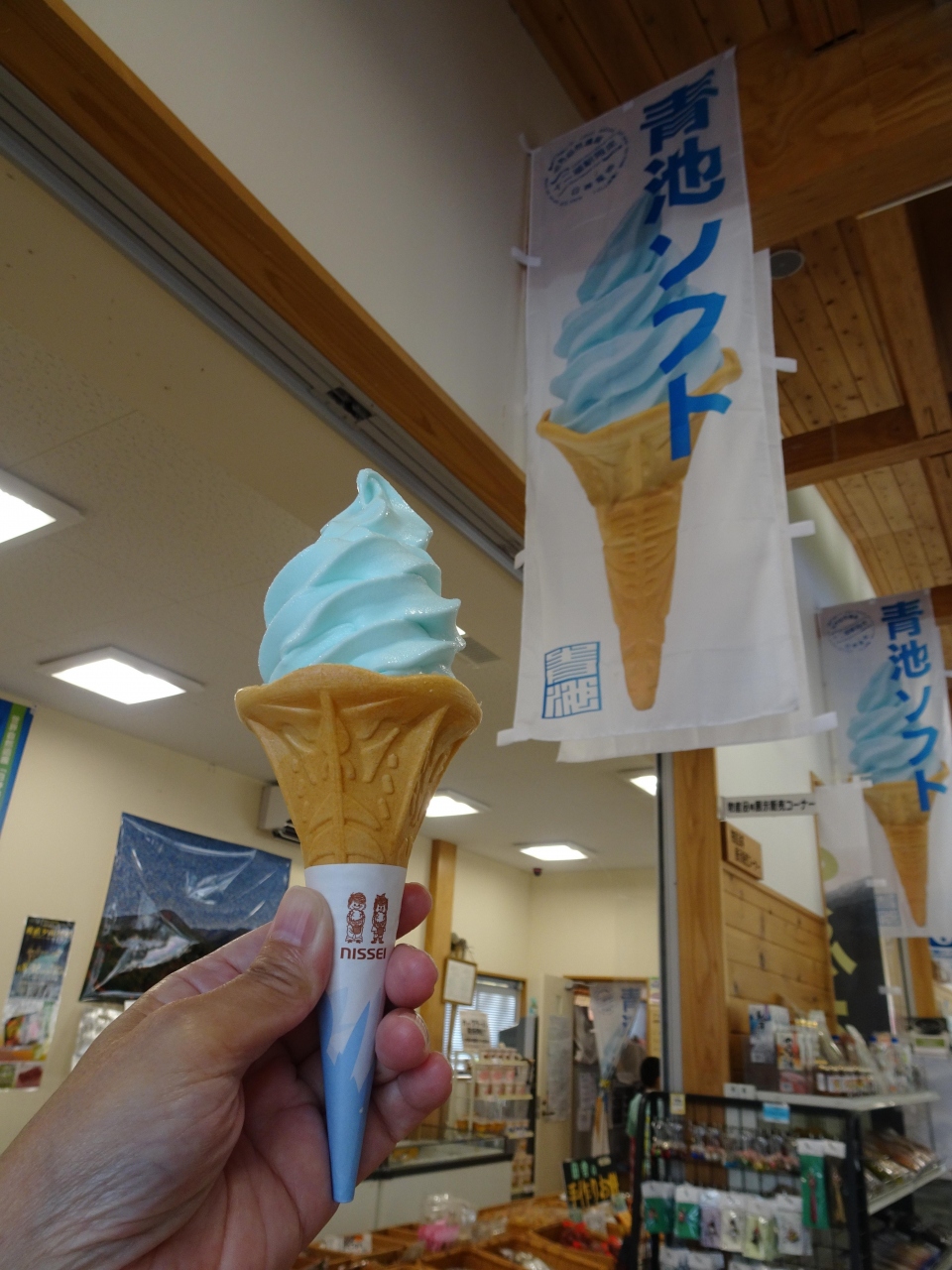 十二湖駅内の「ぷらっと」という販売コーナーに、天井からいくつもの「青池ソフト」の広告があったので、思わず食べてみました。