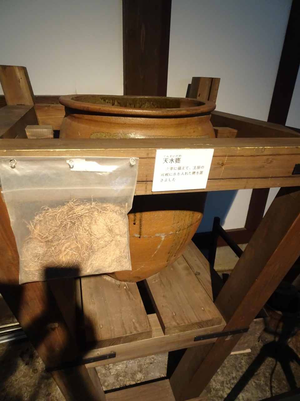 また近くで火事がおこった時、飛び火を防ぐために水をはったものを屋根の上に置いているのですが、そのうちの一つを台所にひとつ展示されています。