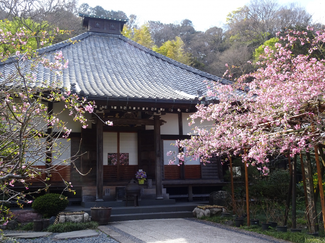 あじさい寺で有名な明月院、開園前から待つ人の列が並びます。