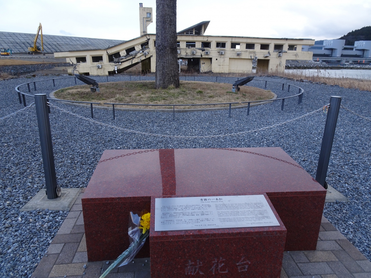 木の前には記念碑があり、奥には松の木と同じく陸前高田ユースホステルが震災遺構として残されていました。