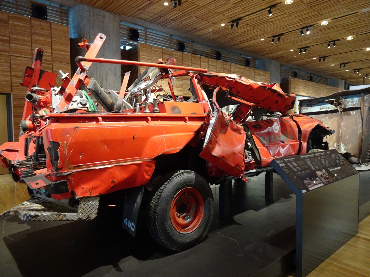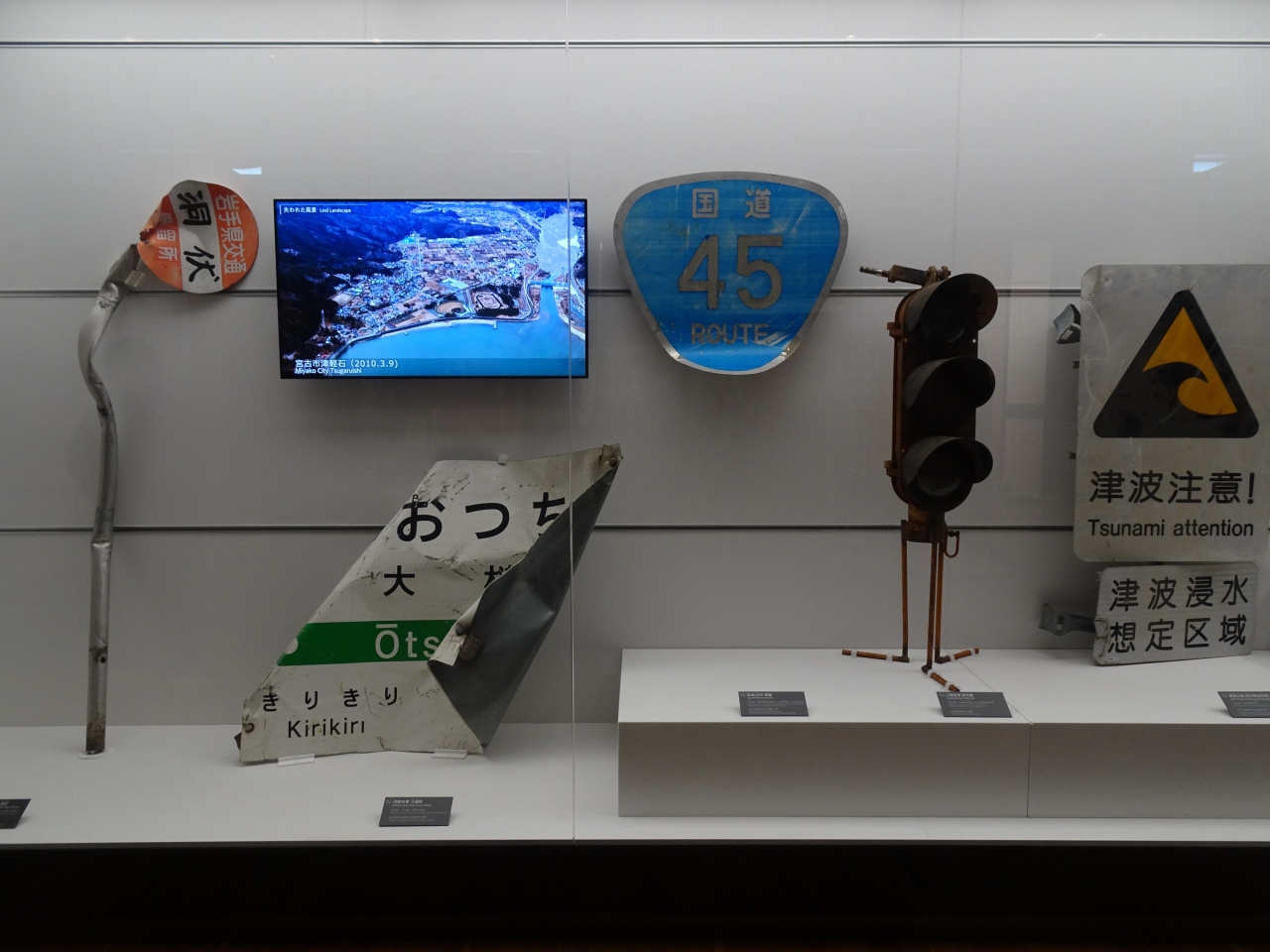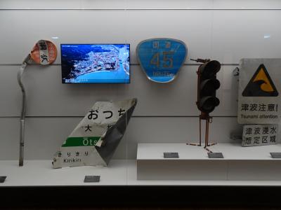 津波によって、無残な姿になった車や看板などの実物、またガラス越しには震災遺構として残された「タピック45」という旧・道の駅の建物も見えます。