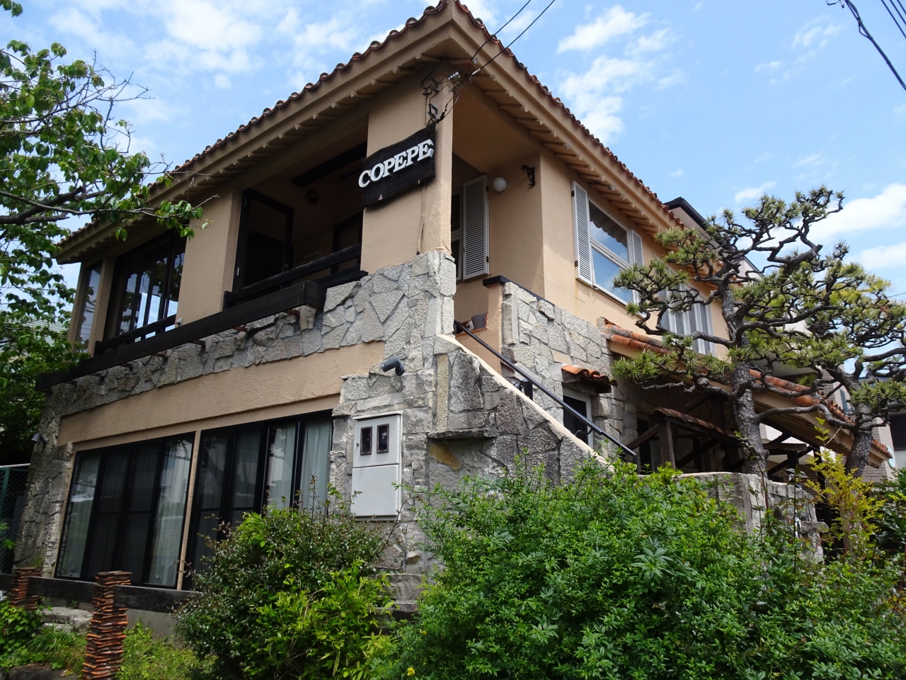 古民家風のお洒落な家屋、外階段を上がって2階が入口です。