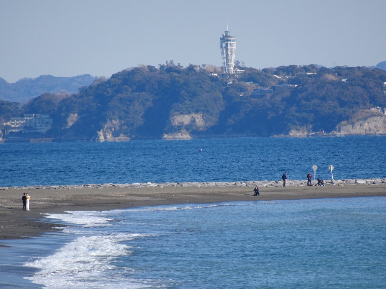 延々と続くビーチから、右に富士山、左に目をやると 海面からひょっこり顔を出す烏帽子岩、そしてさらに右に江ノ島が見えるロケーションです。