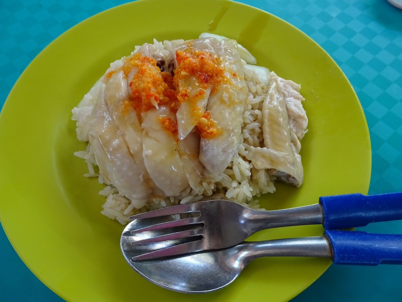 日本のチキンライスとは違って、鶏肉のゆで汁で味付けた御飯の上に、覆うように鶏肉がのっている。