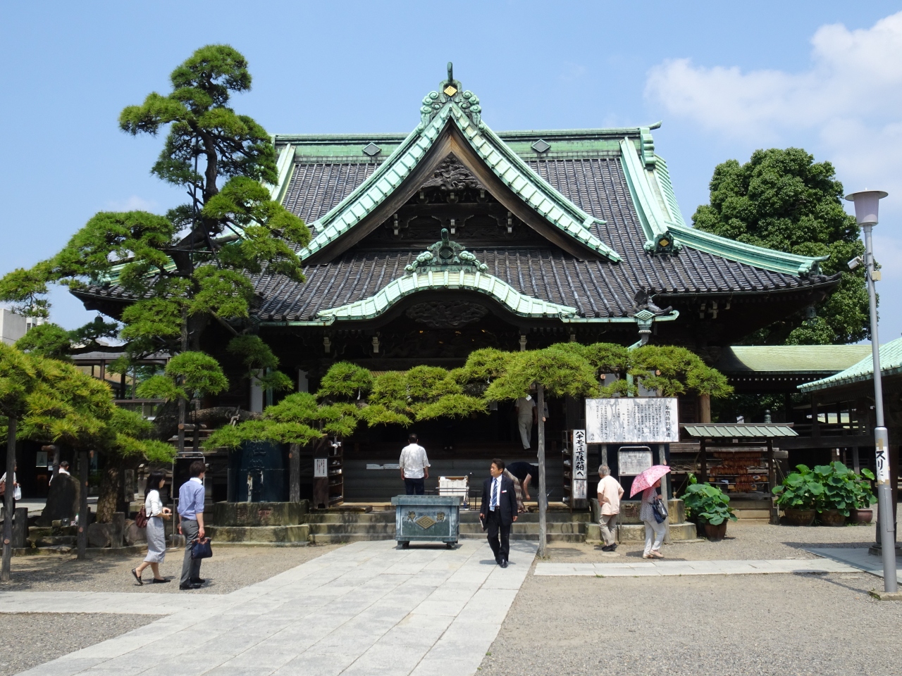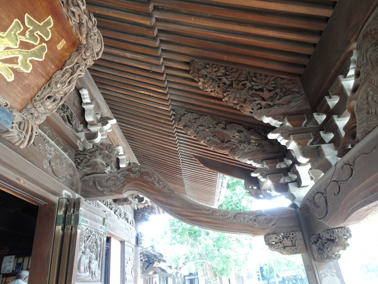 本堂の入口を覆い隠すような立派な松、そして やはり本堂の屋根も門と同じ様式で、屋根を支える柱や扉も 細やかな彫刻が施され、興味を引きます。