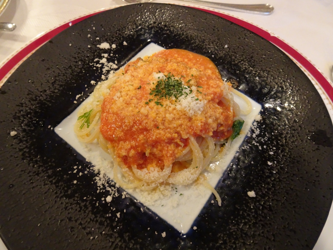 トマトソースのパスタ、コーンスープ、そして メイン料理は肉料理を選びました。