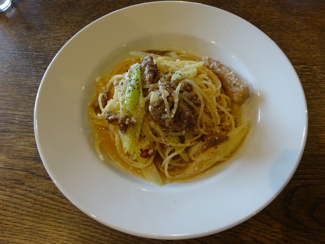 メインは、牛すじと白ネギのペペロンチーノを選びました。