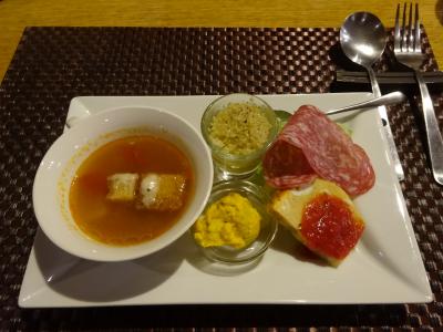 前菜の盛り合わせは、ヒヨコ豆のスープを含むワンプレートで、見た目にも野菜もたっぷり。