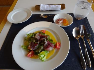 生ハムと柿の付きだしから始まり、前菜はハマチのサラダ。
