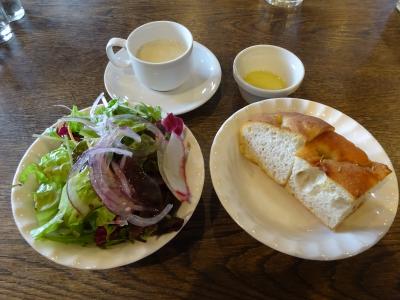 サラダはたっぷりな量で、パンはオレガノ入り、お好みでオリーブオイルをつけていただきます。