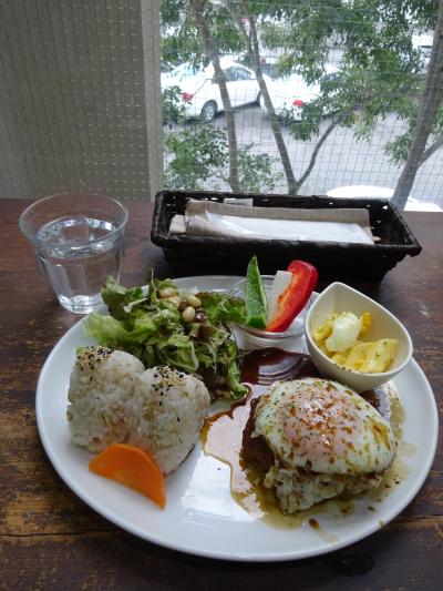 厚みのあるハンバーグが隠れるぐらいの半熟卵がのり、おにぎりが2個ついています。