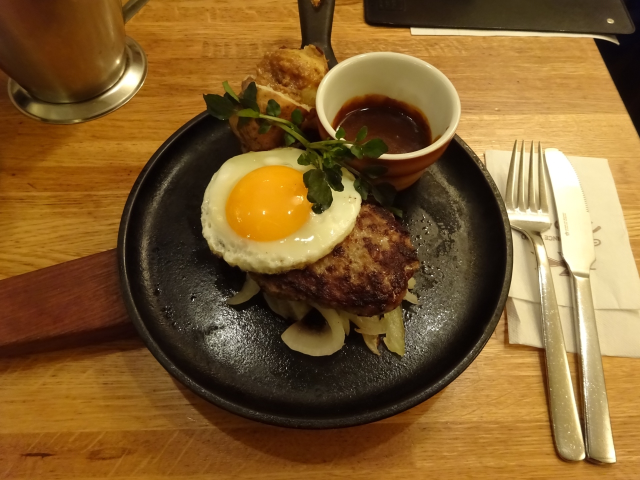 つばめ風ハンブルグステーキは、あっつあつの鉄板に 玉ねぎを敷き詰め、名物のハンバーグ・半熟卵、付け合わせに ふかしたジャガイモが丸ごと、そして ブラウンソースが添えられています。