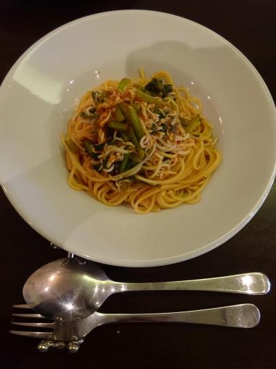 メインのパスタは いくつかある中で、シラスと小松菜のトマトソースパスタを選びました。