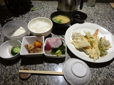 天ぷらの具はエビ、サバの切り身、玉ねぎ、カボチャ、サツマイモ、ししとうなど。