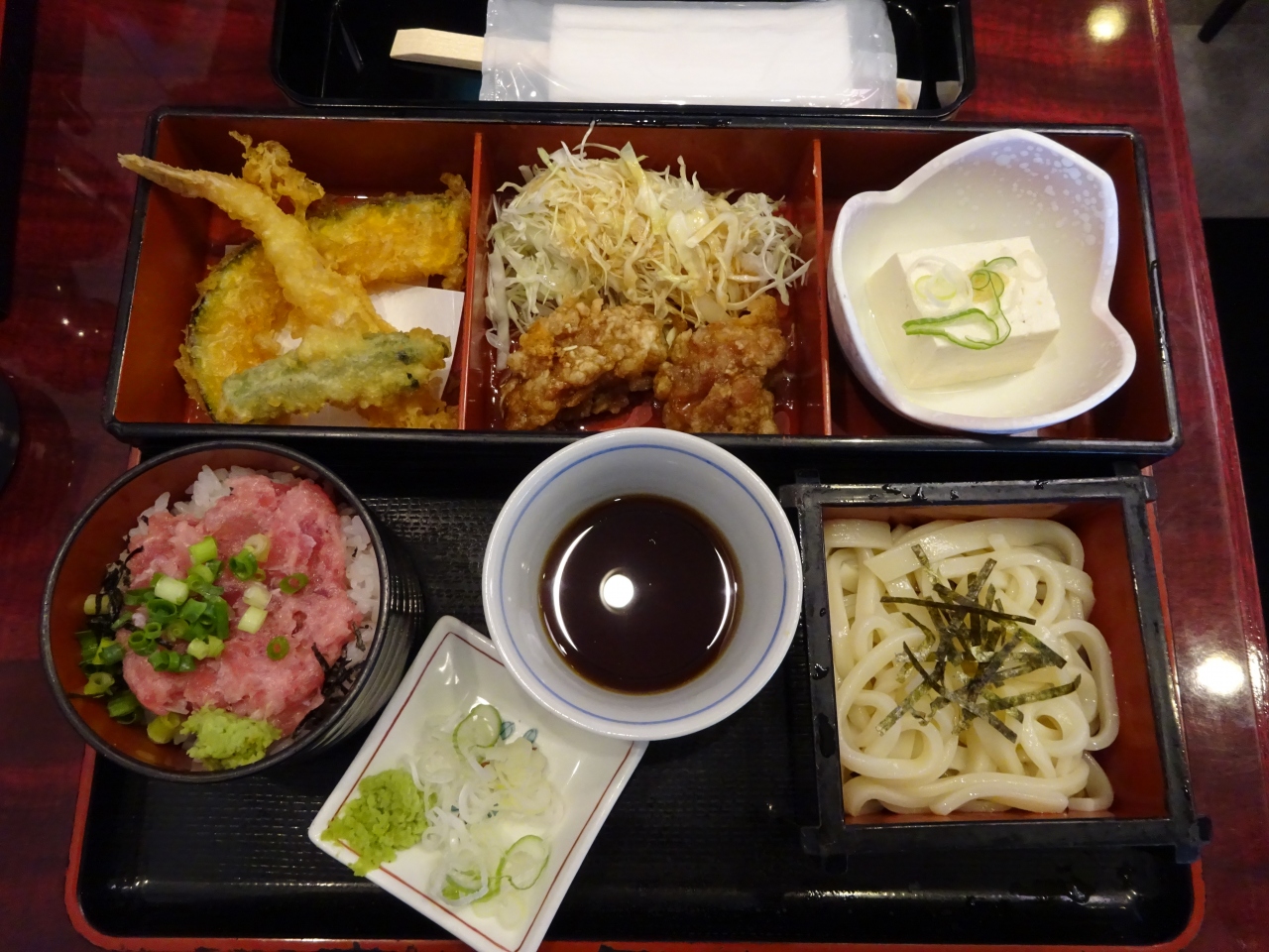 天ぷら、鶏のからあげ、冷ややっこのおかずに、ミニサイズのネギトロ丼と冷やしうどん付き。