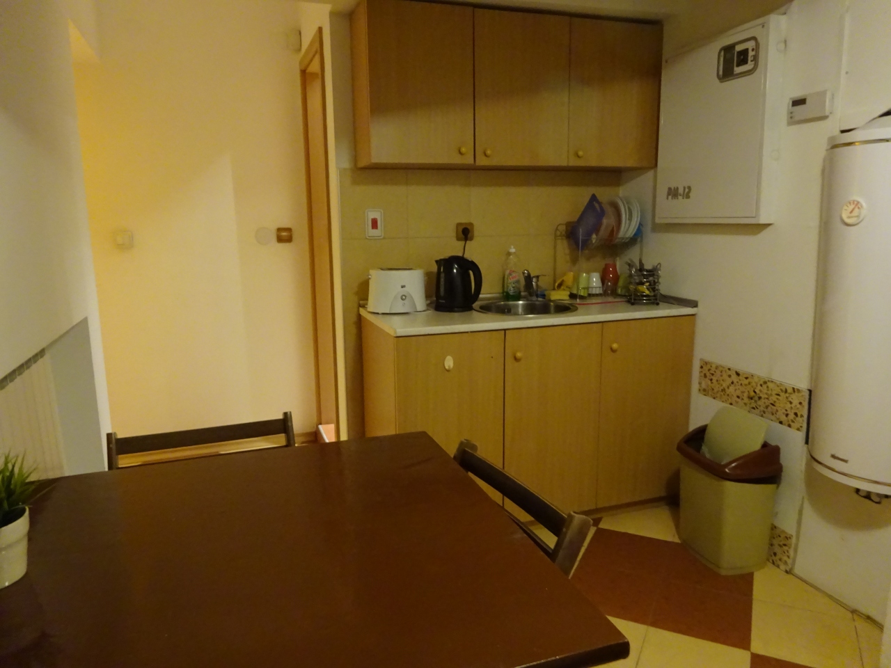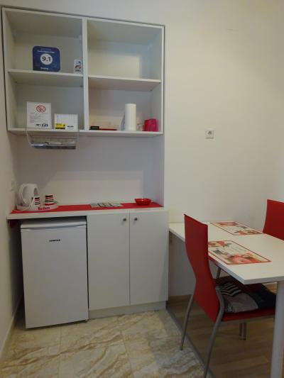 簡易キッチンには 電子レンジやコンロはありませんが、湯沸しポット、冷蔵庫、食器やカトラリも揃っています。