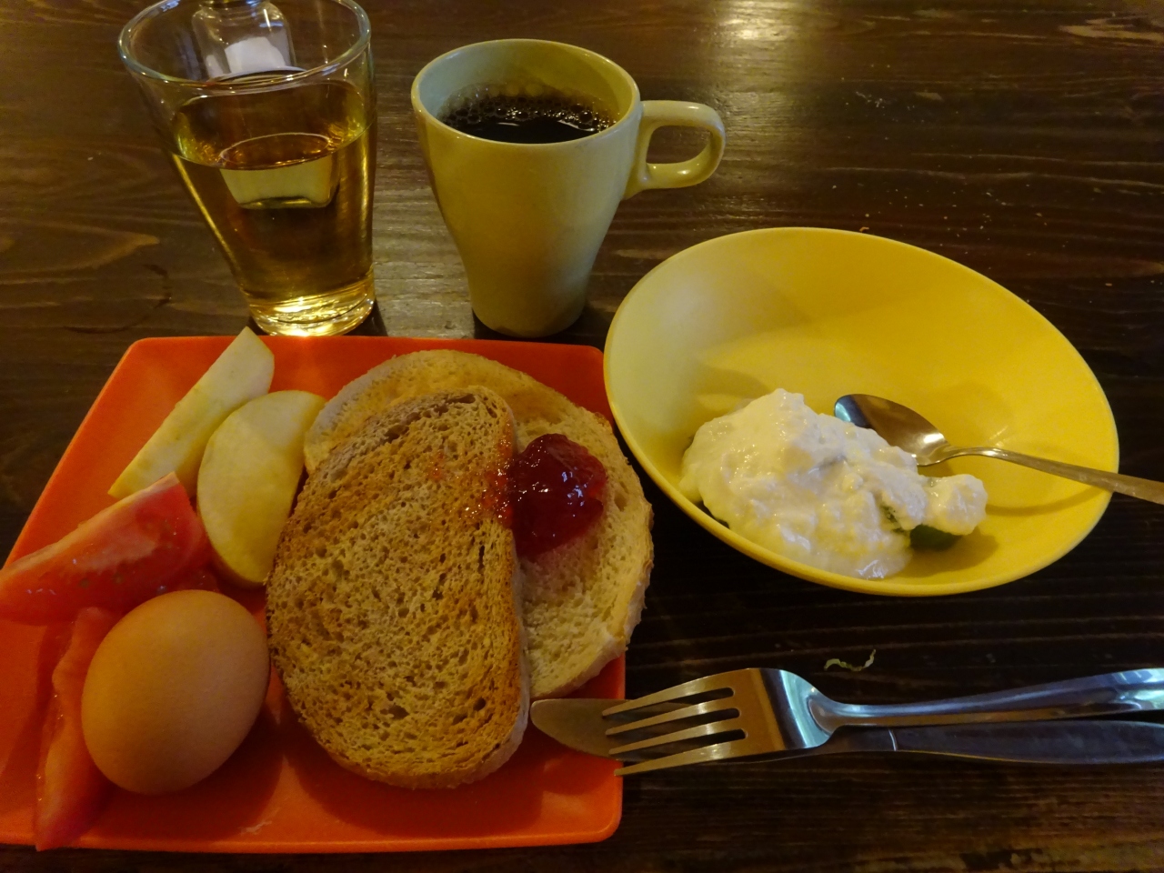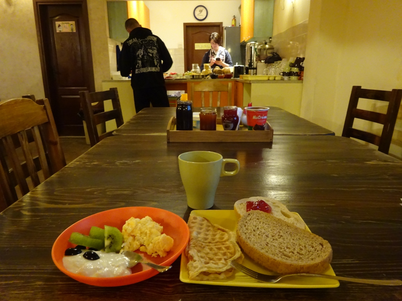 朝食は朝8時からで、少し不愛想な若い女性が ワッフルや炒りすぎのスクランブルエッグを提供してくれます。