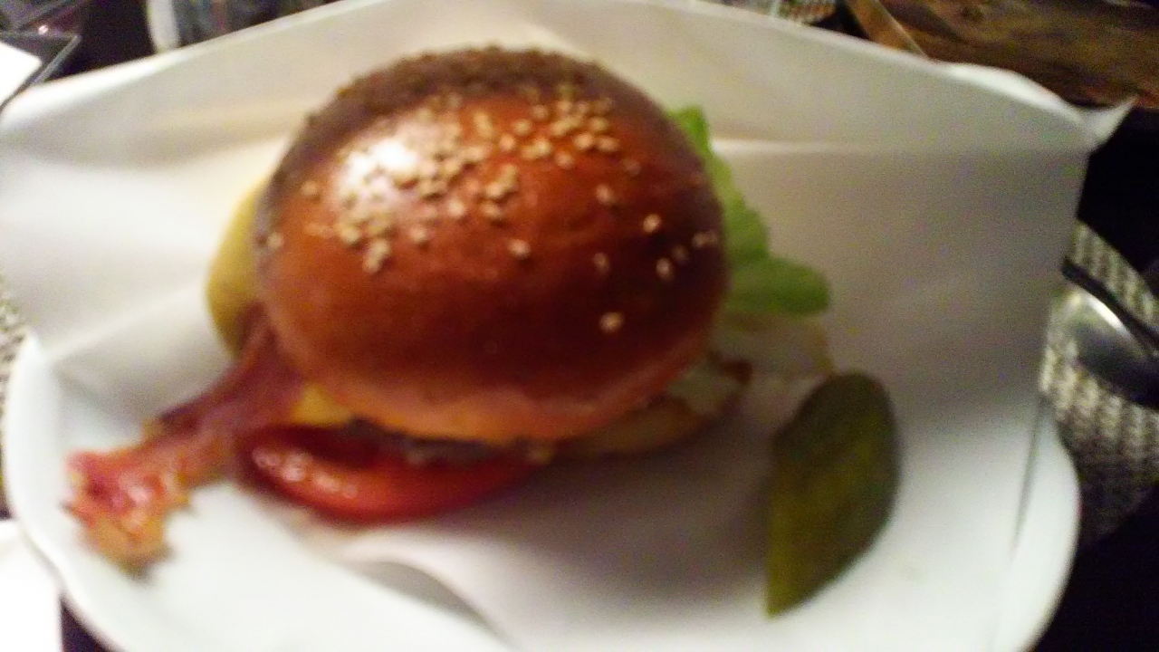 メインはハンバーガー? っていうのも意外性がありますが、これが案外ボリュームがあって、大きな口を開けてガブリ。
