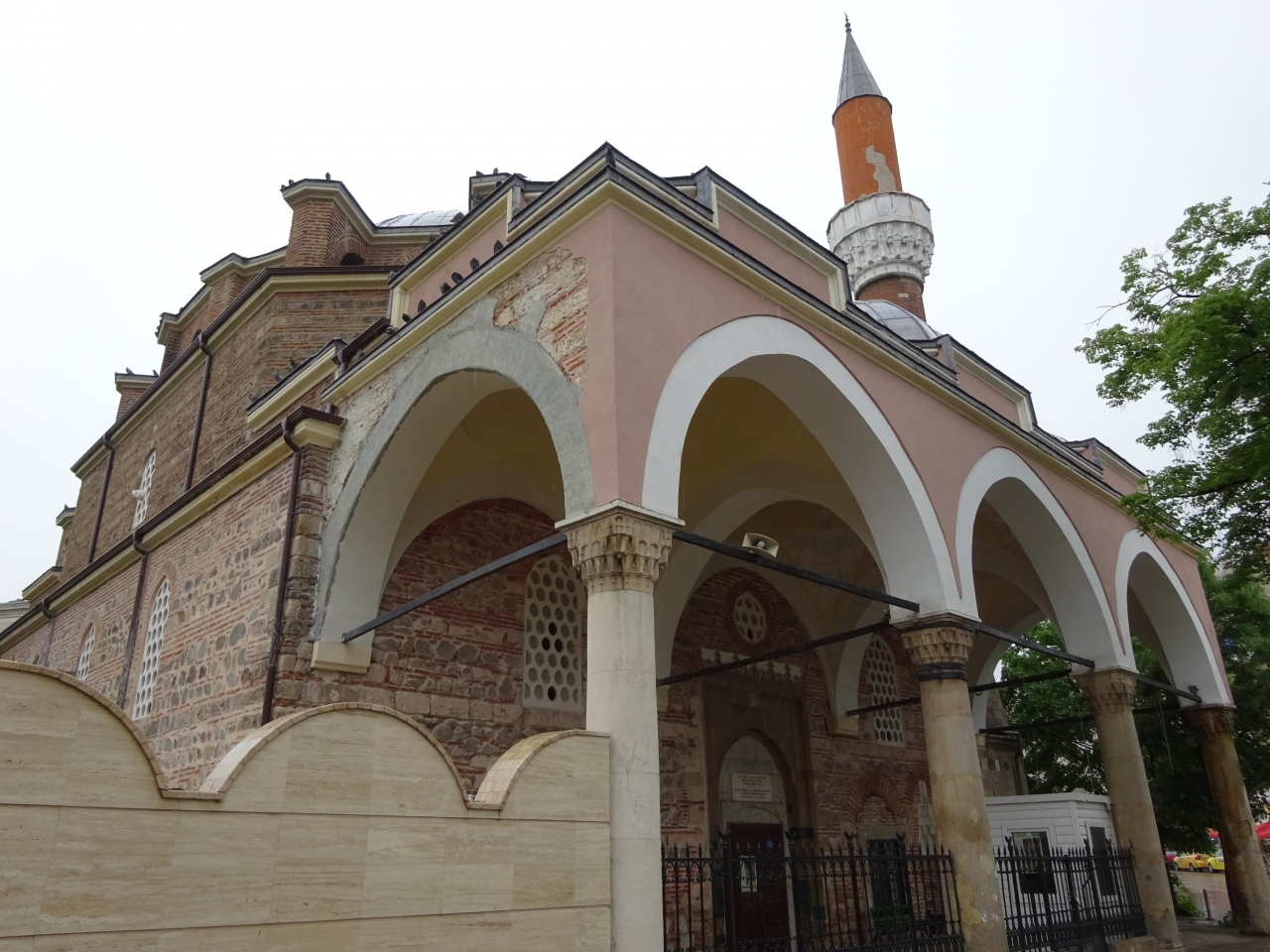丸い大きな屋根と高い尖塔が目印のイスラム寺院。