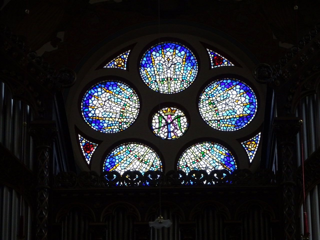 中に入れば、白い壁の天井も ステンドグラスも 丸い彫刻のデザインで、女性的なイメージの教会です。- 旅行時期