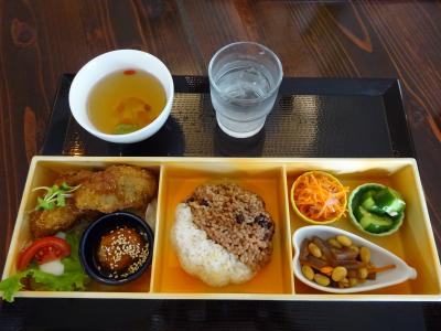 本日のランチは、その日のメインを選び (この日は そら豆のコロッケ vs 味噌カツ、だったので、後者を選びました) そして ご飯も 酵素玄米・雑穀米、あるいは 半分ずつのハーフかを選びます (両方食べたいので、ハーフをチョイス)。