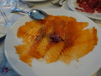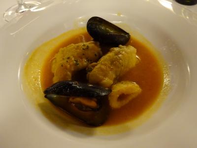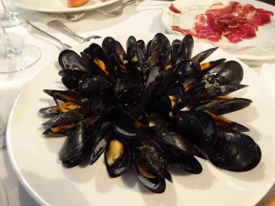 最初の生ハムや おつまみになる揚げ物料理の数々、サーモンのマリネ、ムール貝も最高!