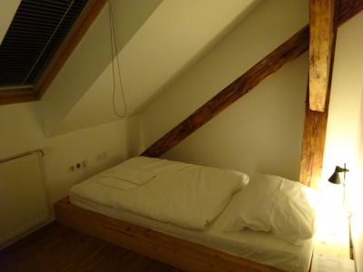 個室は天窓のある屋根部分の部屋で、卓上ライトと ベット2台しかありません (ゴミ箱もなし)。