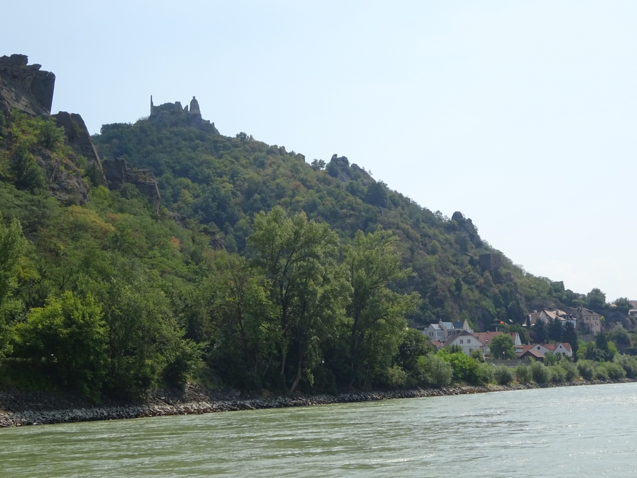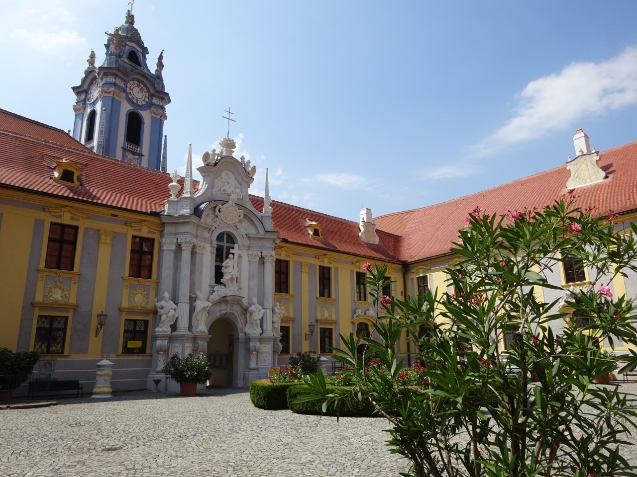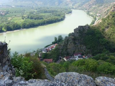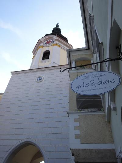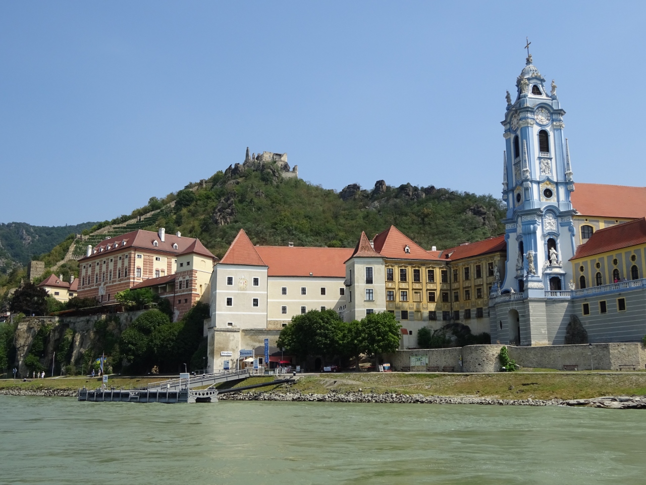 ドナウ川を船で下ると、デュルケンシュタインの船着場の先端に建つ 水色と白い色がまばゆい教会に 目を魅かれます。