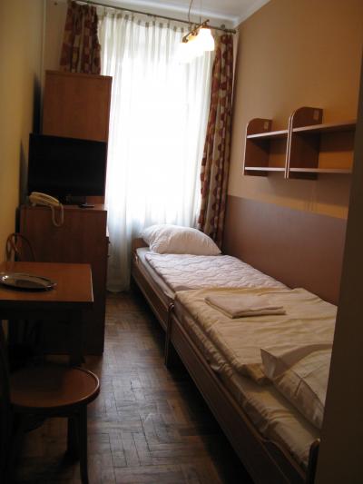 縦に細長い造りの部屋でしたが、TV・机・ロッカーもあり (但し、冷蔵庫はなし)、シャワー付きで、滞在には申し分ありません。