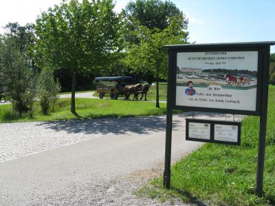 船着場そばのチケット売り場で切符を購入した後、島の奥に歩いていくと、(馬車での送迎もあります) 樹木に囲まれたヘレンキムゼー城が見えてきます。