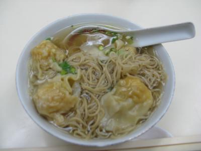 小さなお椀に かためのストレート麺、具がたくさん詰まった水餃子が入っています。
